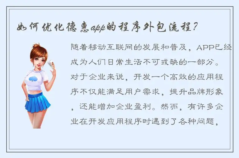 随着移动互联网的发展和普及,APP已经成为人们日常生活不可或缺的一部分。对于企业来说,开发一个高效的应用程序不仅能满足用户需求,提升品牌形象,还能增加企业盈利。然而,有许多企业在开发应用程序时遇到了各种问题,而最麻烦的可能是外包开发流程。本文将重点讨论如何优化德惠APP的程序外包流程,以便市场推广更顺畅,减少沟通瑕疵。