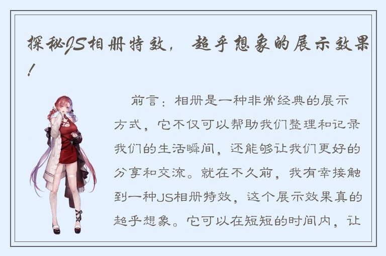 前言:相册是一种非常经典的展示方式,它不仅可以帮助我们整理和记录我们的生活瞬间,还能够让我们更好的分享和交流。就在不久前,我有幸接触到一种JS相册特效,这个展示效果真的超乎想象。它可以在短短的时间内,让满屏的图片翻转、飞舞、堆叠...而无须刷新页面。那么,今天,就让我们一起探秘这种神奇的JS相册特效吧!